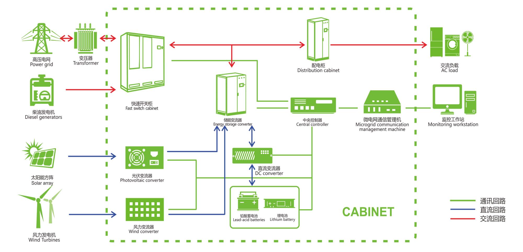 礦鑫離并網(wǎng)解決方案不僅能在保持電網(wǎng)穩定的前提下進(jìn)行對各輸入能源的高效轉換,其智能分布式控制管理系統也可確保優(yōu)先、高效使用可再生能源,最大程度地減小對燃料的消耗(特別適用于偏遠/離網(wǎng)地區) ,保證整個(gè)系統穩定、安全、可靠的運行及能量供給。